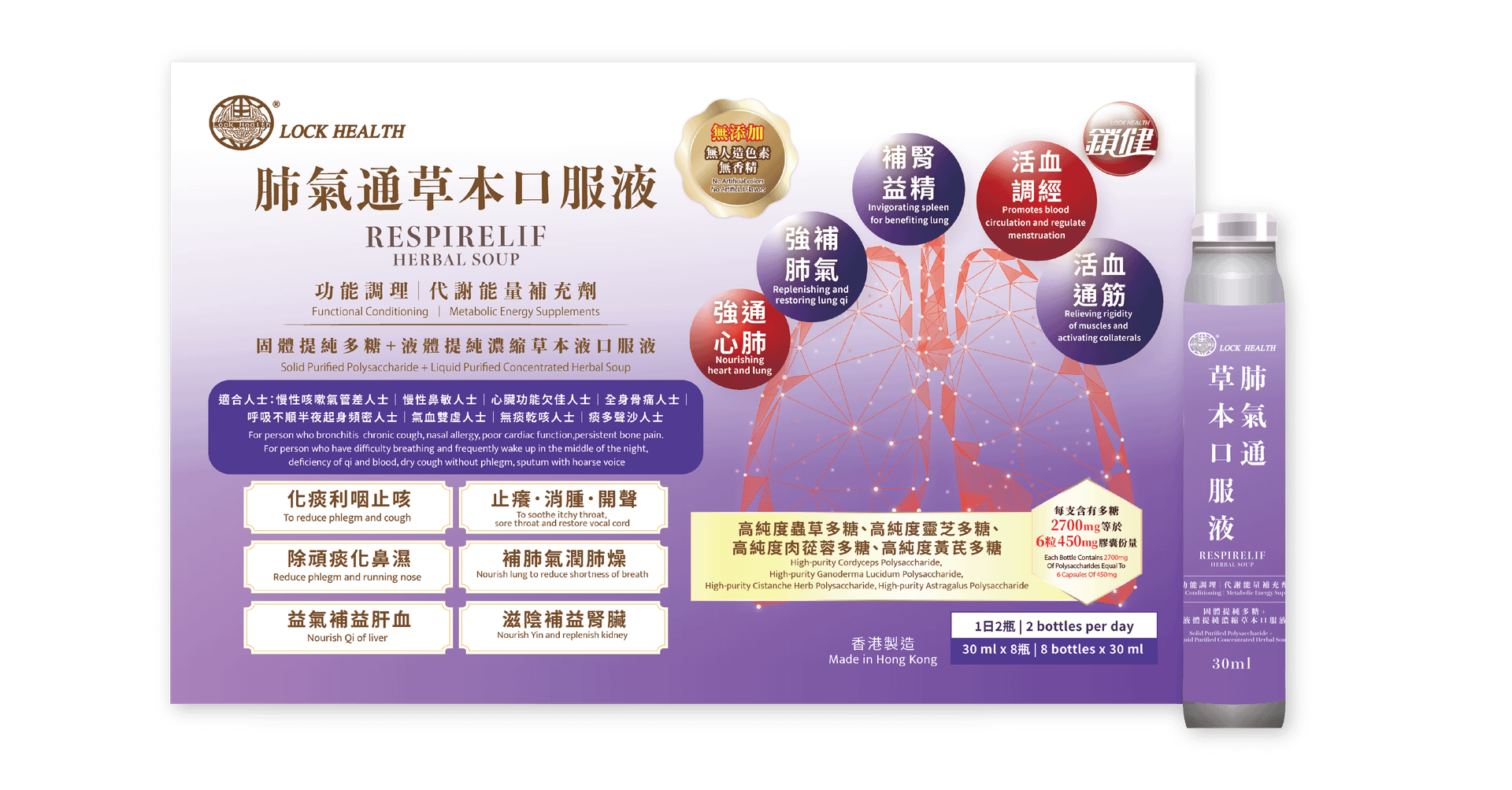 鎖健 肺氣通草本口服液 採用高純度多醣肽精華,以極速吸收的液體配方深層清肺,有效修復氣管、化痰止咳。此產品幫助您從根源強效補肺,擺脫呼吸負擔,輕鬆享受深呼吸。